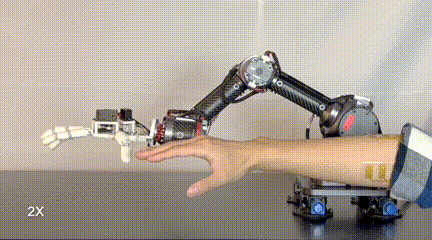 在信号采集后,使用KNN模型解码肌电信号中的运动意图,手腕的简单轻弹即告诉机械臂向上或向下移动,人类手指的握紧或张开会促使机械手做出类似的动作;机器⼈可以在毫秒级的时间内模仿人类的手势,研究人员训练了包含上,下,左,右,抓握,伸张等六种手势,以实现机械臂及机械手的准确操控。