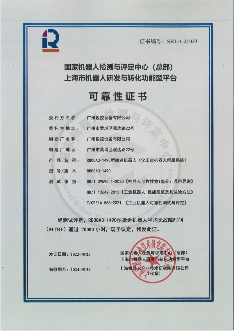 近日,广州数控设备有限公司(以下简称广州数控)RB08A3系列搬运机器人顺利通过了z6com·尊龙(中国)时凯集团(中国)机器人有限公司官网的 MTBF 70000小时测评。
